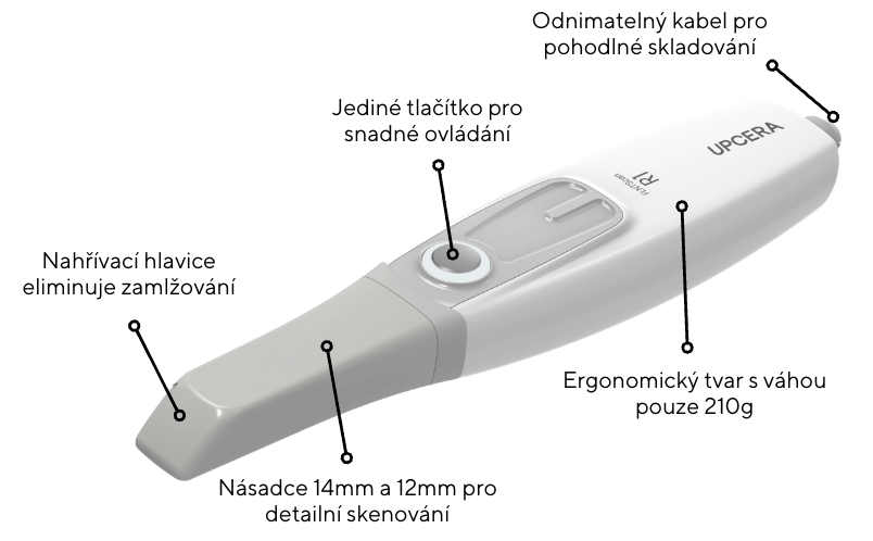 Skenování pomocí Upcera R1 je mimořádně jednoduché a efektivní. Skener disponuje jediným ovládacím tlačítkem, díky čemuž lékař ani sestra nemusí během práce sahat na myš – veškeré funkce lze ovládat přímo ze skeneru. Vyhřívaná hlavice zabraňuje mlžení a zároveň zajišťuje vyšší komfort pro pacienta, protože působí příjemně teplým dojmem v ústech.