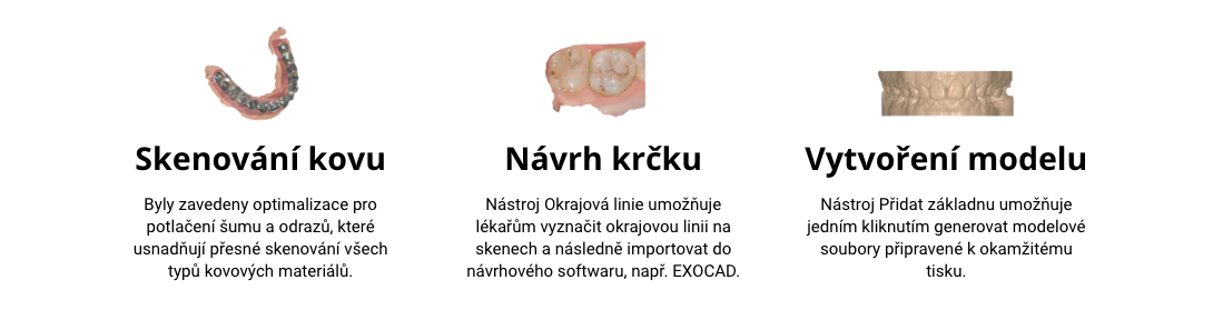 Součástí systému jsou také nástroje pro práci s kovy, diagnostika zdravotního stavu úst pacienta (rozpoznání kazů, zubního kamene, apod.) precizní zakreslení margin line a automatické vygenerování modelu pro přípravu dat k 3D tisku.