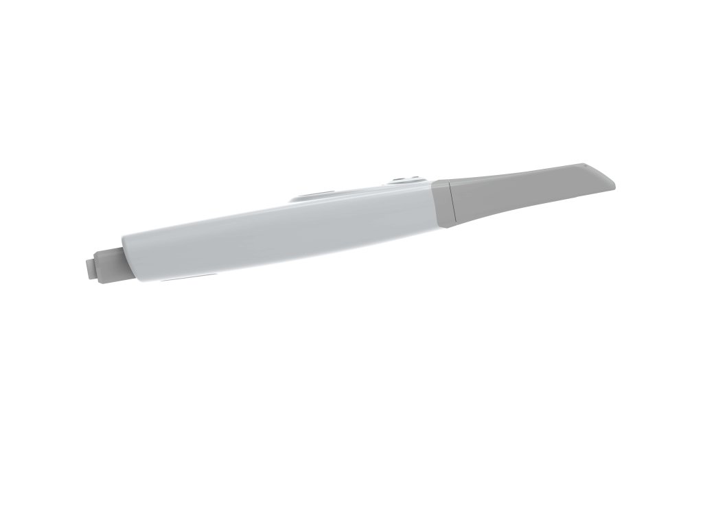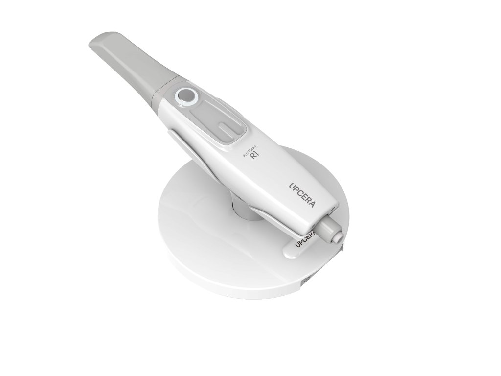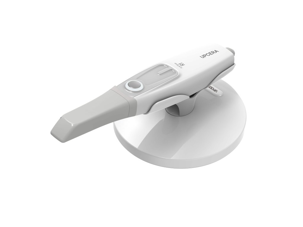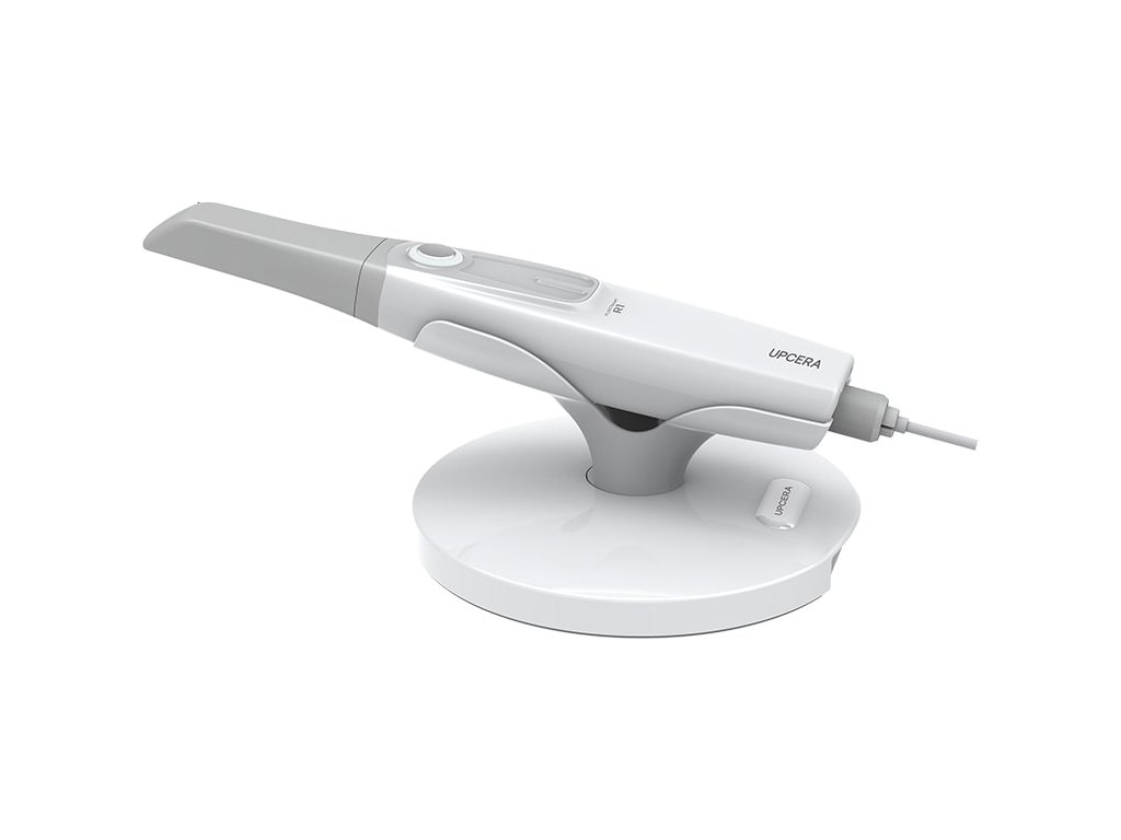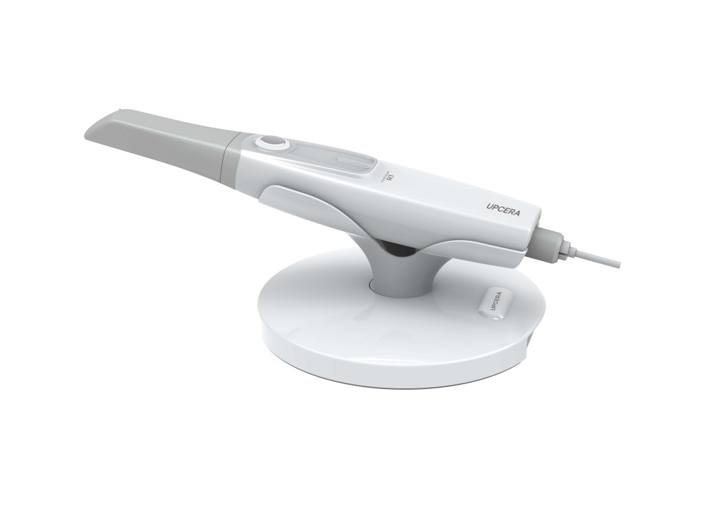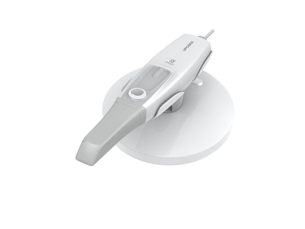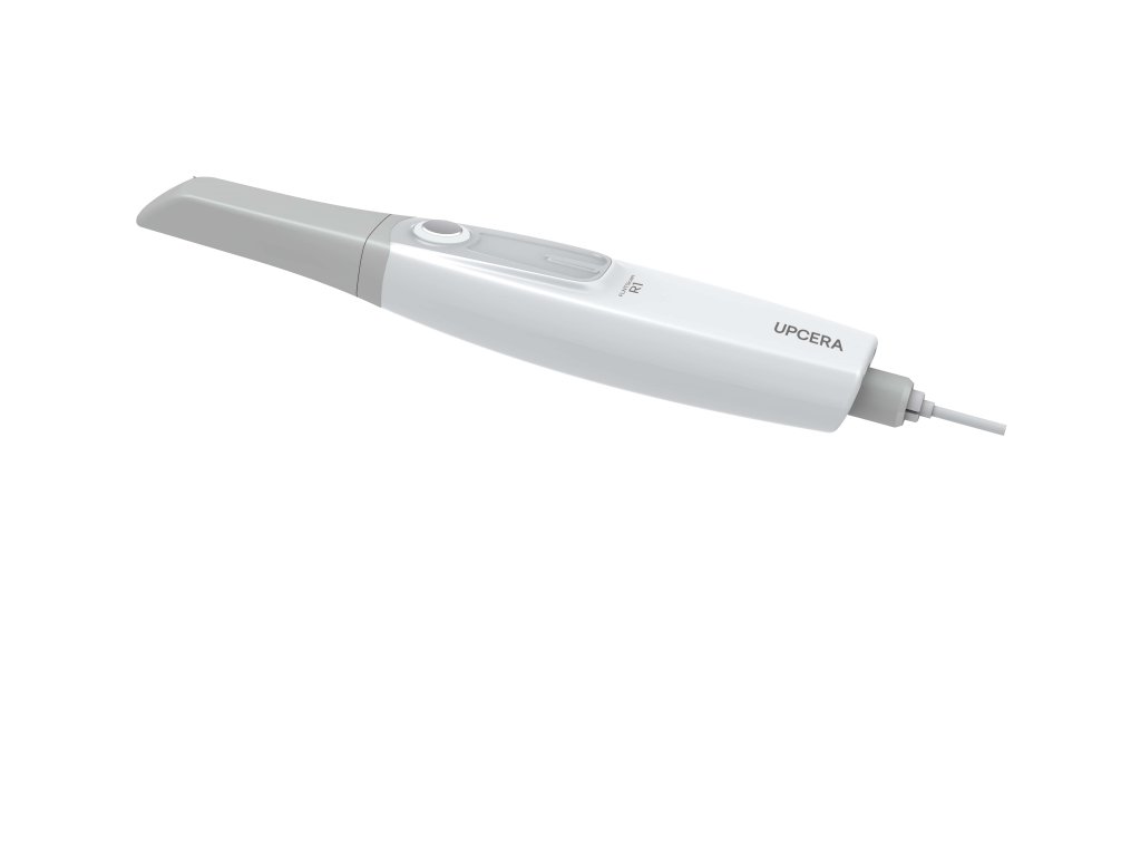 Intraorální skener Upcera R1 zaujme vysokou kvalitou zpracování – působí pevně, odolně a prémiově, přesto je lehčí než některé jiné modely a velmi pohodlně se s ním manipuluje. Skener je vybaven odnímatelným a dostatečně dlouhým kabelem, který zajišťuje pohodlnou manipulaci během práce. Součástí balení je praktický stojan pro bezpečné odložení skeneru, dva náhradní kabely a tři skenovací hlavice – dvě ve standardní velikosti a jedna menší, určená pro práci v menší ústní dutině nebo na obtížně přístupných místech.