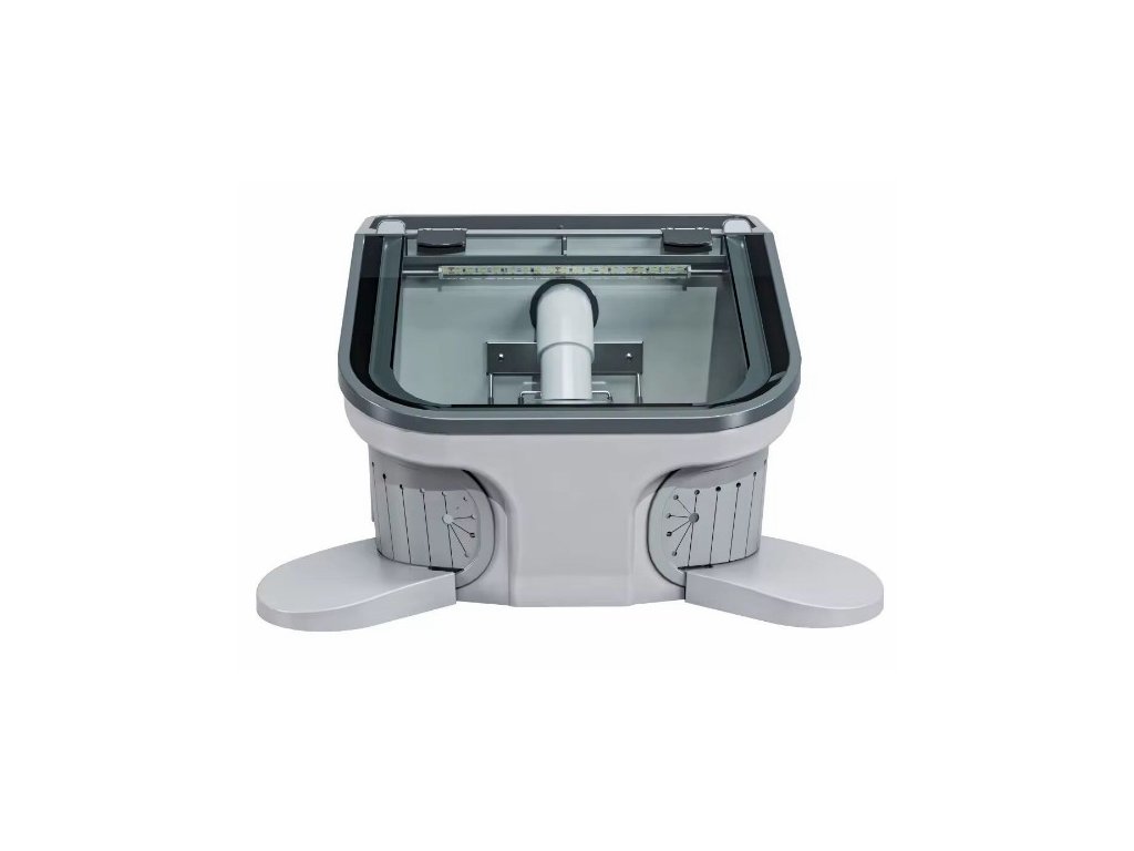Odsávací box s led osvětlením a napojením pro vlastní odsávání. Těsnění v oblasti rukou proti prašnosti. Odkládací prostor.