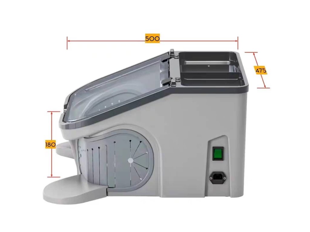 Odsávací box s led osvětlením a napojením pro vlastní odsávání. Těsnění v oblasti rukou proti prašnosti. Odkládací prostor.